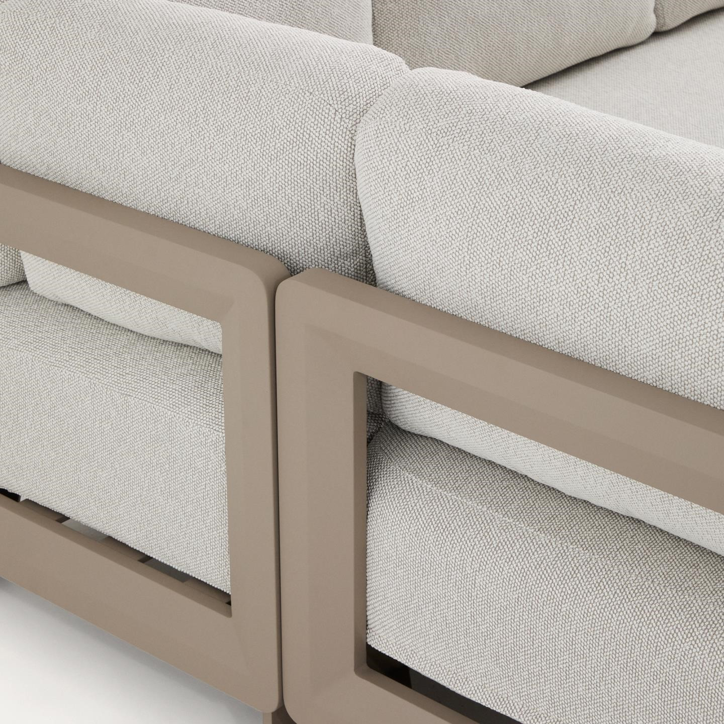 Poduszki z wypełnieniem o średniej twardości wyposażono w zdejmowane pokrowce, wykonane z wytrzymałej tkaniny poliestrowej o wysokiej odporności na ścieranie (ponad 45 000 cykli Martindale). Hydrofilowa powłoka ułatwia spływanie wody, ograniczając wchłanianie wilgoci i zwiększając funkcjonalność zestawu podczas użytkowania na zewnątrz. Stabilność użytkowania podnosi maksymalne obciążenie do 280 kg oraz antypoślizgowe stopki chroniące podłoże.