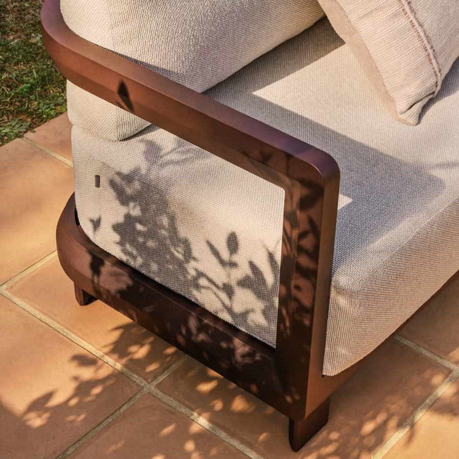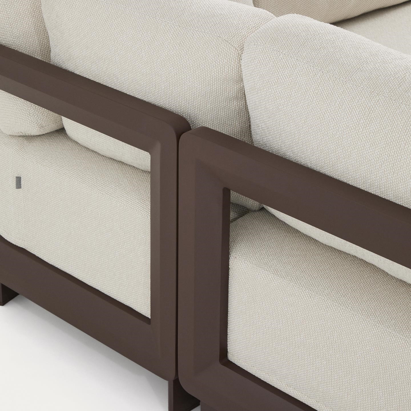 Poduszki z wypełnieniem o średniej twardości wyposażono w zdejmowane pokrowce, wykonane z wytrzymałej tkaniny poliestrowej o wysokiej odporności na ścieranie (ponad 45 000 cykli Martindale). Hydrofilowa powłoka ułatwia spływanie wody, ograniczając wchłanianie wilgoci i zwiększając funkcjonalność zestawu podczas użytkowania na zewnątrz. Stabilność użytkowania podnosi maksymalne obciążenie do 280 kg oraz antypoślizgowe stopki chroniące podłoże.
