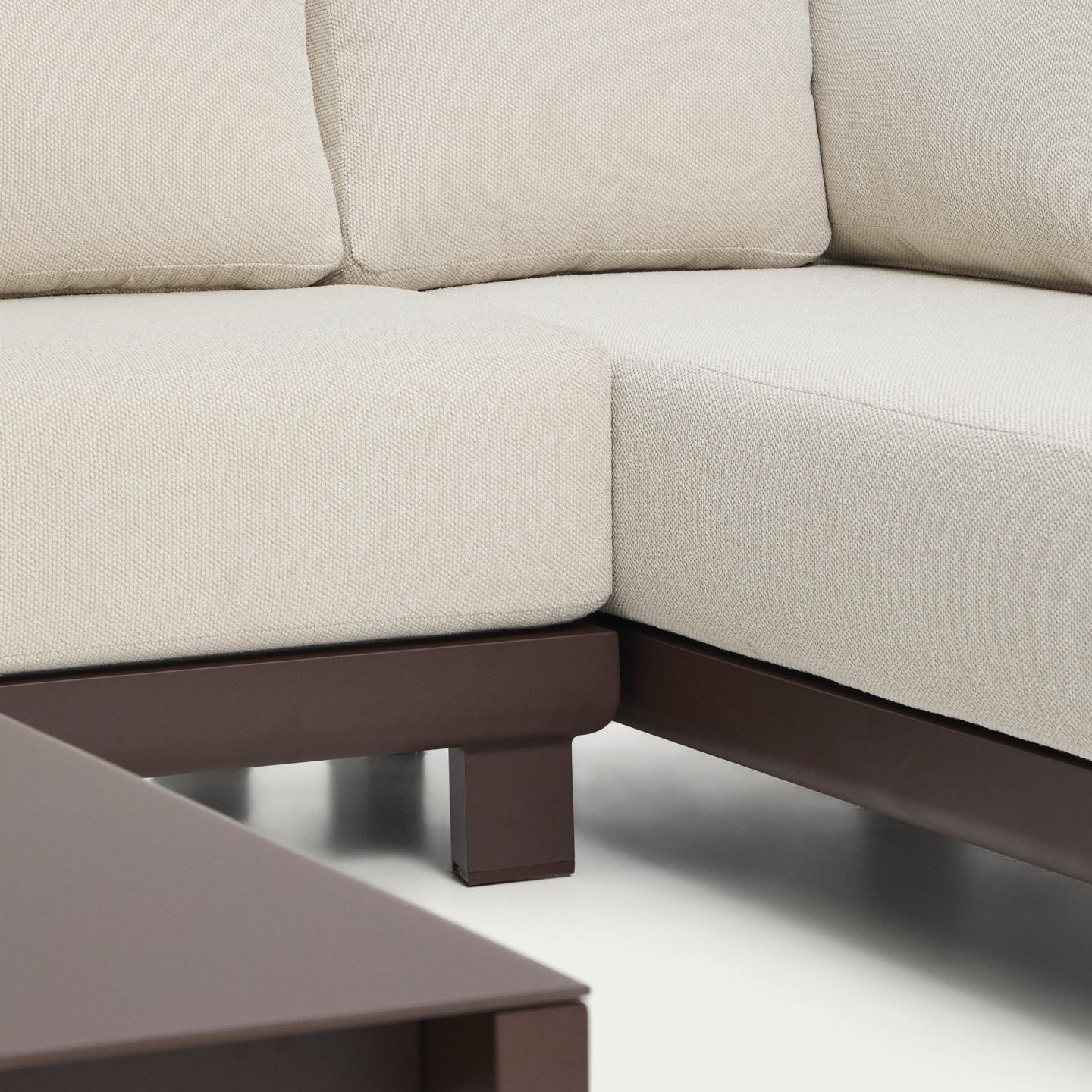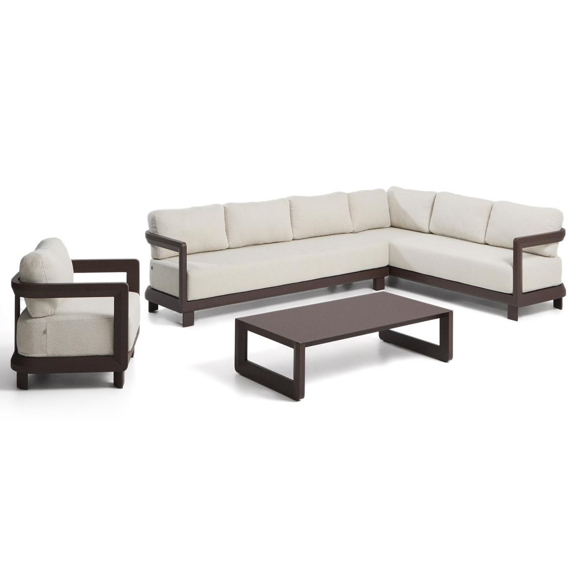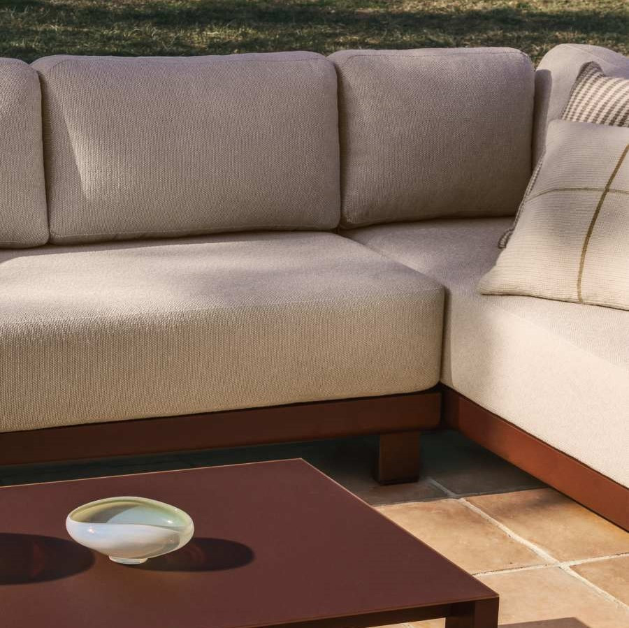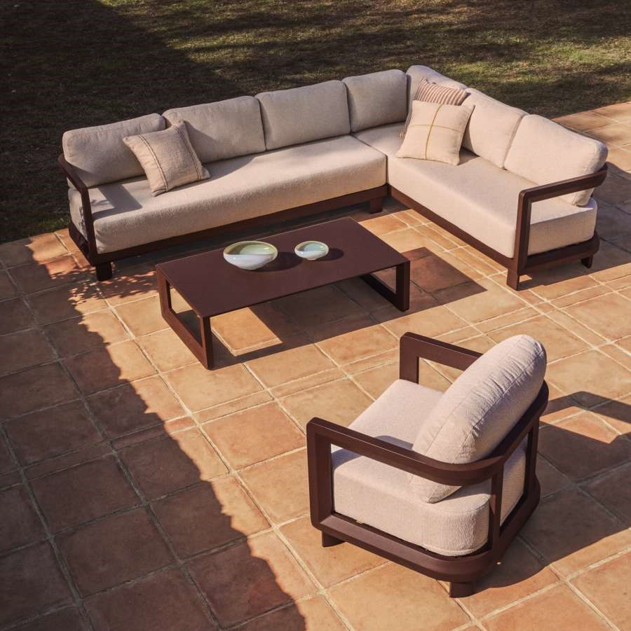 Zestaw ogrodowy Nerano to nowoczesna strefa wypoczynkowa zaprojektowana z myślą o komfortowym relaksie na tarasie, w ogrodzie lub przestrzeni komercyjnej. W skład kompletu wchodzi 5-osobowa sofa narożna, fotel oraz stolik kawowy z hartowanego szkła, tworząc spójną i funkcjonalną aranżację outdoorową. Konstrukcja oparta na lekkim aluminium malowanym proszkowo zapewnia wysoką odporność na rdzę, korozję oraz promieniowanie UV, co przekłada się na trwałość w zmiennych warunkach atmosferycznych.