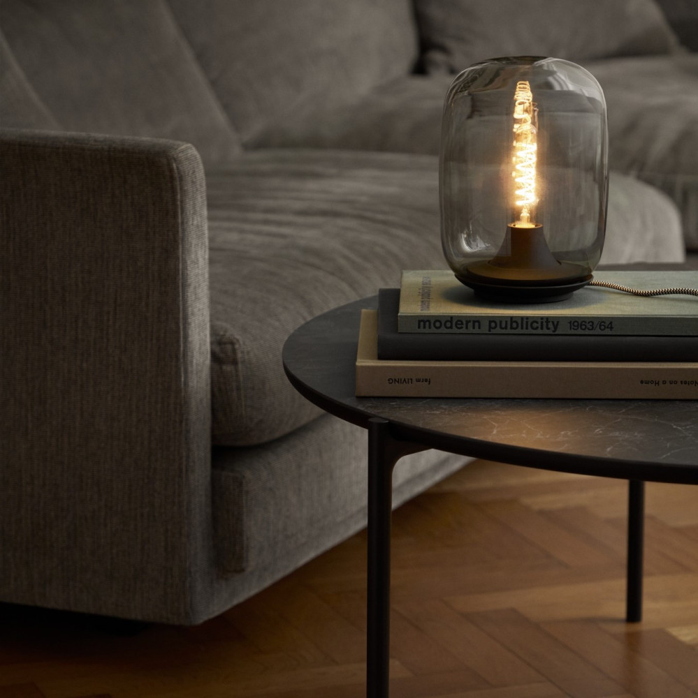 Nowoczesna lampa stołowa inspirowana vintage’owymi wzmacniaczami lampowymi, która wprowadza do wnętrza przytulną, ciepłą atmosferę. Jej charakterystyczna, szklana kopuła delikatnie rozprasza światło, dając miękki, świecowy blask idealny do relaksu i odpoczynku. Lampa Acorn to doskonały wybór na półkę z książkami, stolik w salonie lub lampkę nocną przy łóżku. Elliptyczny, ręcznie dmuchany klosz dostępny jest w dwóch eleganckich wariantach kolorystycznych; amber oraz stone. Matowa podstawa świetnie kontrastuje z dekoracyjnym, tekstylnym przewodem, podkreślając nowoczesny i jednocześnie subtelny design.
