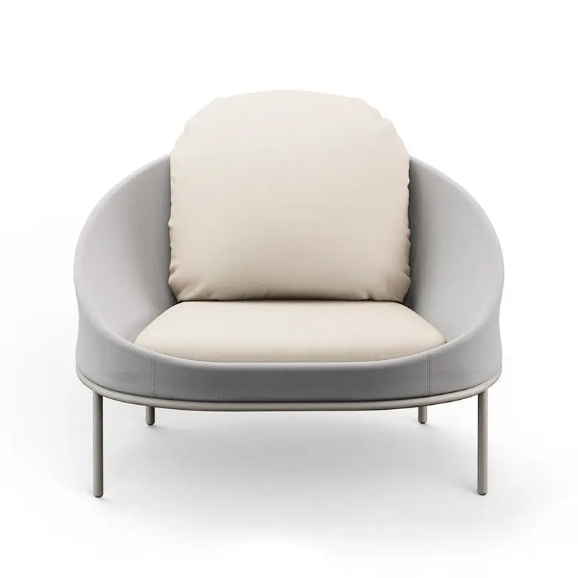 Konstrukcja fotela w tym smukłe nogi wykonane zostały z lekkiego aluminium. Część wypoczynkowa to tkanina Sunbrella oraz tkanina z gatunku Sunbrella Meshes (w ofercie producenta znajduje się 17 tkanin z tej kategorii).