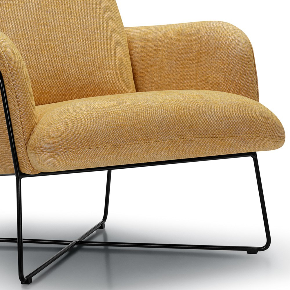 Szenilowa tapicerka w tkaninie Sunny Yellow wnosi do wnętrza energię i świeżość, tworząc mocny, dekoracyjny akcent. Ciepły odcień żółci ożywia przestrzeń i dobrze kontrastuje z chłodną, metalową podstawą, dzięki czemu fotel sprawdza się zarówno w nowoczesnych, jak i eklektycznych aranżacjach.