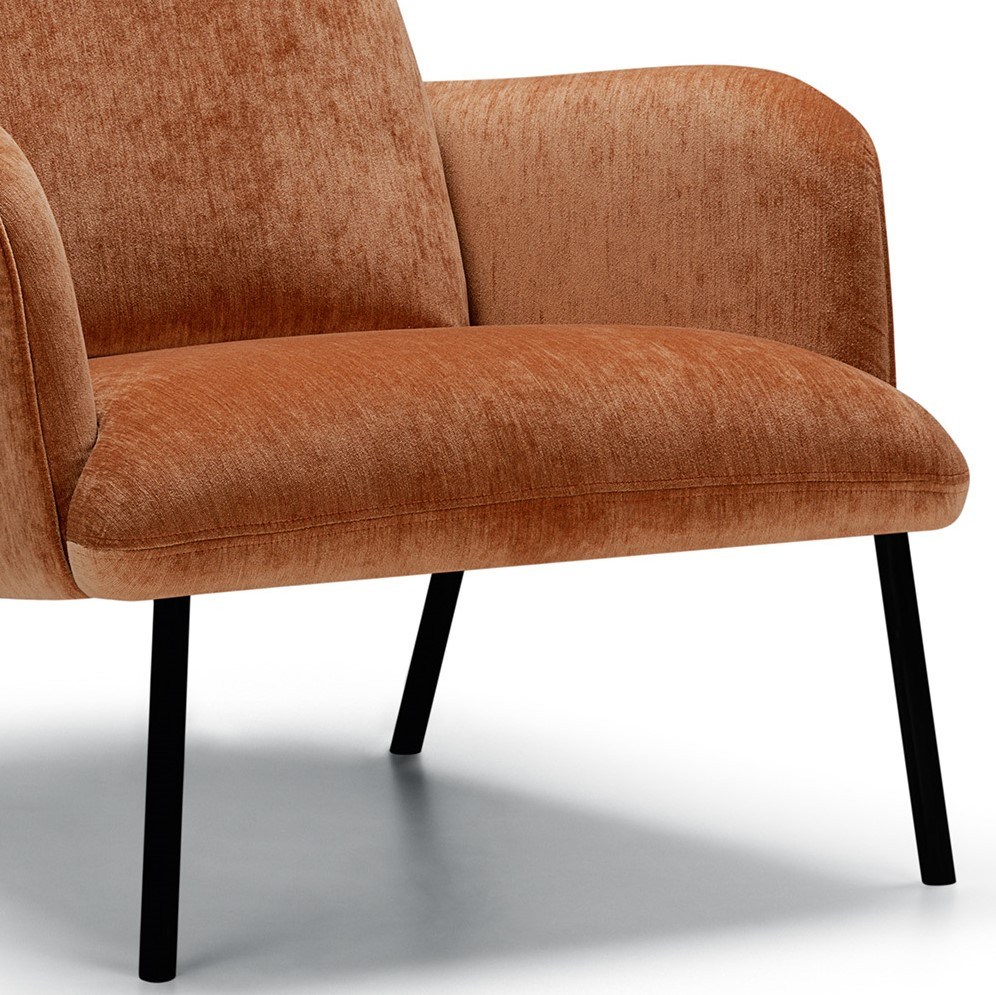 Tapicerka w tkaninie Eliot Orange wnosi do wnętrza ciepły, wyrazisty akcent kolorystyczny, który ożywia przestrzeń i nadaje jej bardziej przytulny, a jednocześnie nowoczesny charakter. Melanżowa struktura materiału podkreśla głębię koloru i dobrze komponuje się z minimalistyczną, metalową podstawą.