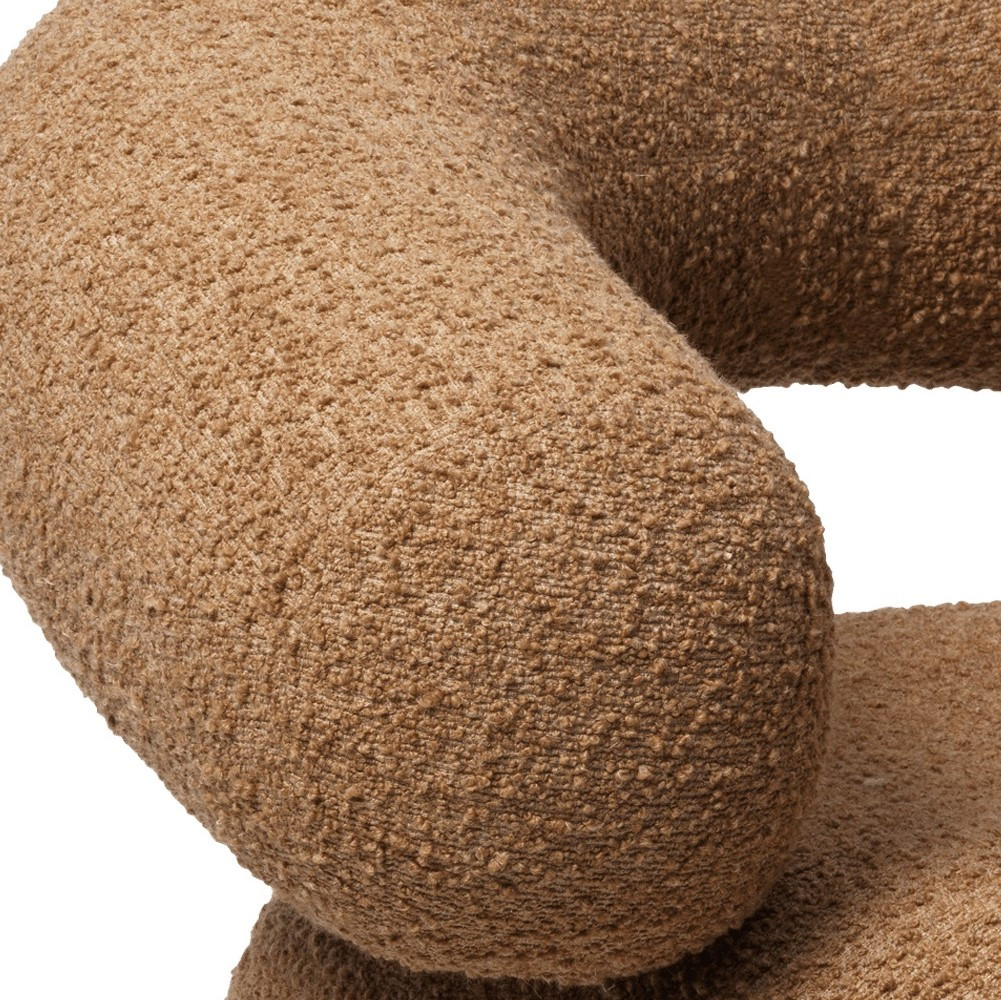 Model wykonany jest ręcznie w Europie i tapicerowany wysokiej jakości tkaniną bouclé w odcieniu karmelowego brązu (Tan) – ciepłym, naturalnym kolorze, który wprowadza do wnętrza przytulność i spójność aranżacji. Konstrukcja oparta na drewnie z certyfikatem FSC™ oraz wypełnienie z pianki zapewniają trwałość i wygodę na co dzień.